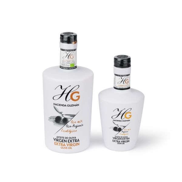Extra Virgin Olive Oil "Organic Blend", White Bottle - 8.8 fl oz or 17 fl oz, by Hacienda Guzman, Spain.